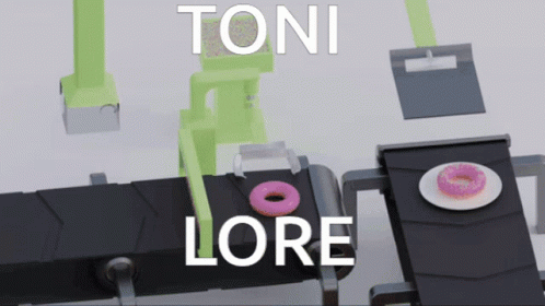 Content Description: a conveyor belt with a pink donut on it and the name toni lore