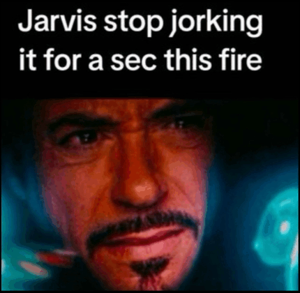 Content Description: a close up of a man 's face with the words jarvis stop jerking it for a sec this fire