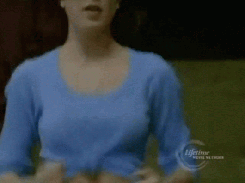 Content Description: a woman in a blue shirt is on a lifetime movie network advertisement
