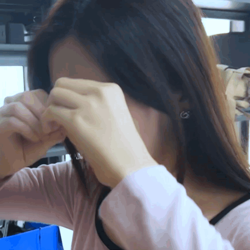 Content Description: a woman covering her face with her hands while wearing earrings with the letter g on them