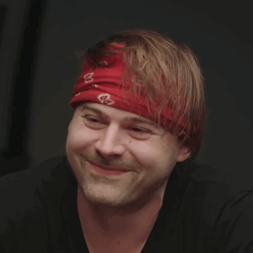 Content Description: a man wearing a red bandana with the letter g on it smiles