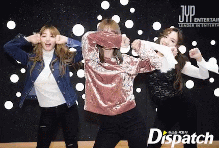 Content Description: a group of girls are dancing in front of a sign that says dispatch