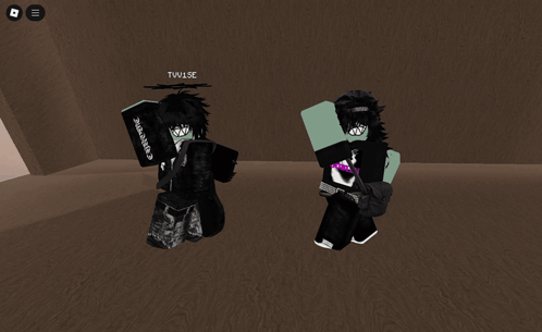Content Description: two roblox characters are standing next to each other and one of them has twwise written on his head