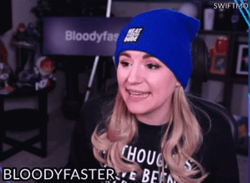 Content Description: a woman wearing a blue beanie and a black shirt with the words bloodyfaster on it
