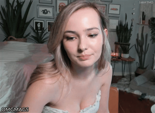 Content Description: a woman in a white top is looking at the camera with omgmags written below her