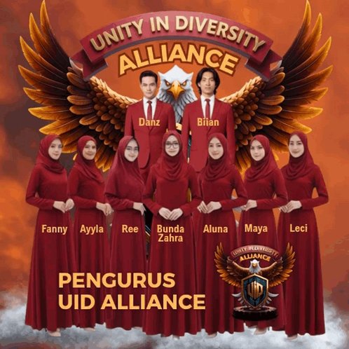 Content Description: a group of people standing in front of an eagle that says unity in diversity