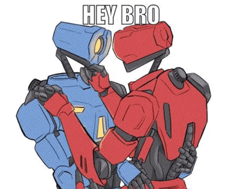 Content Description: a cartoon of two robots hugging with the words hey bro written above them