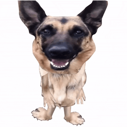 Content Description: a german shepherd with arms and legs is smiling with its mouth open