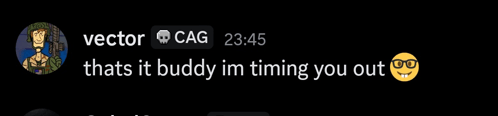 Content Description: a screenshot of a text message between vector and cag that says " thats it buddy im timing you out "