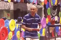 Content Description: a bald man in a blue and white striped shirt is standing in front of a wall of colorful frisbees .