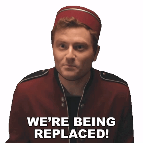Content Description: a man wearing a red hat and a red jacket says we 're being replaced
