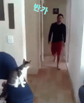 Content Description: a man in a black shirt and red shorts is walking in a hallway while a cat looks on
