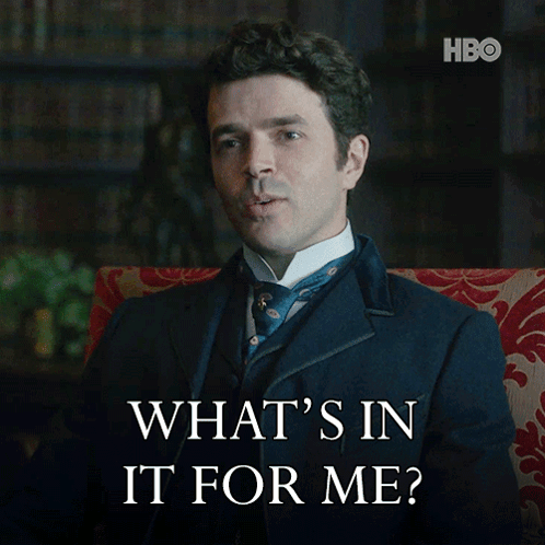 Content Description: a man in a suit sits in a chair with the words what 's in it for me below him