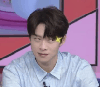 Content Description: a young man in a blue shirt with a yellow star on his forehead .