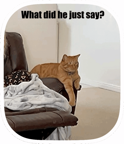 Content Description: a cat laying on a couch with the words " what did he just say " above it