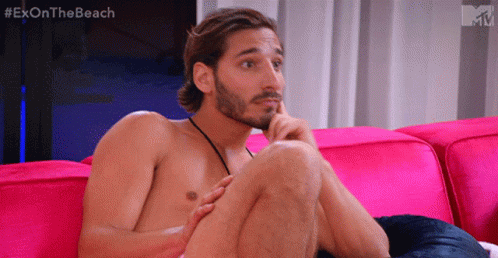 Content Description: a shirtless man is sitting on a pink couch with the hashtag #exonthe beach