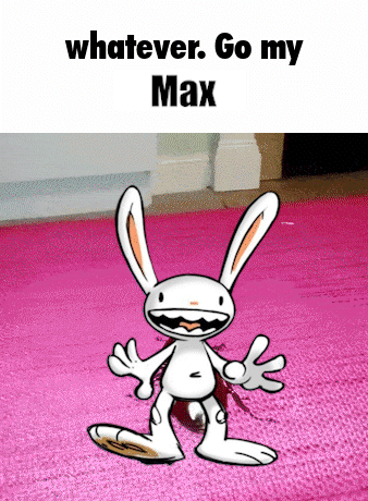 Content Description: a cartoon rabbit is standing on a pink rug with the words whatever go my max above it