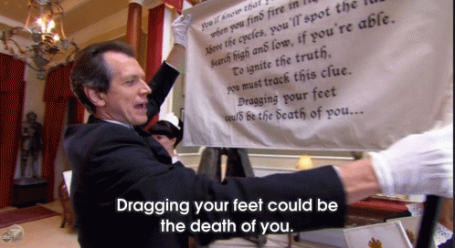 Content Description: a man in a suit is dragging a large piece of paper that says dragging your feet could be the death of you