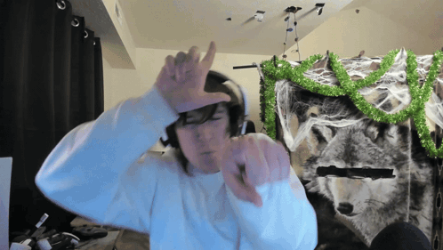 Content Description: a man wearing headphones stands in front of a wall with a picture of a wolf and spider webs