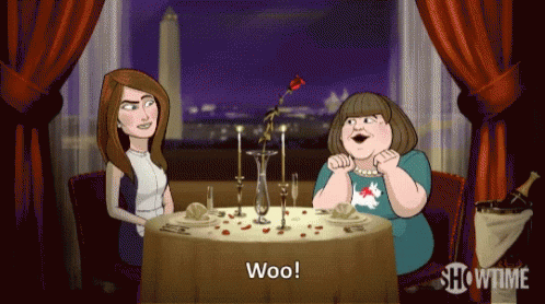 Content Description: a cartoon of two women sitting at a table with the words woo on it