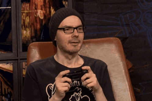 Content Description: a man wearing glasses and a hat is holding a game controller