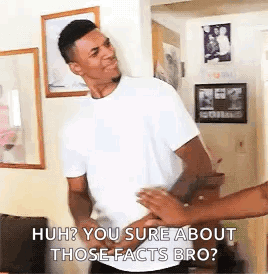 Content Description: a man in a white shirt is standing next to a woman in a living room and talking to her .