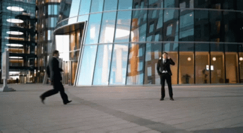 Content Description: a man in a suit is talking on a cell phone while another man walks by