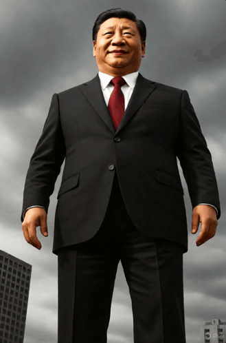 Content Description: a man in a black suit and red tie stands in front of a cloudy sky