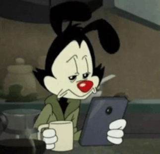 Content Description: a cartoon character is holding a cup of coffee and looking at a tablet .
