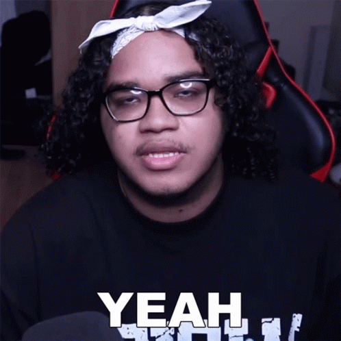 Content Description: a man with curly hair wearing glasses and a bandana that says yeah