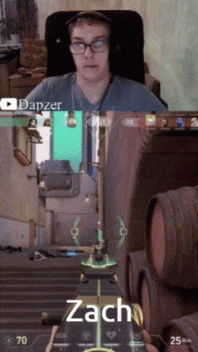 Content Description: a man wearing glasses is playing a video game with the name zach