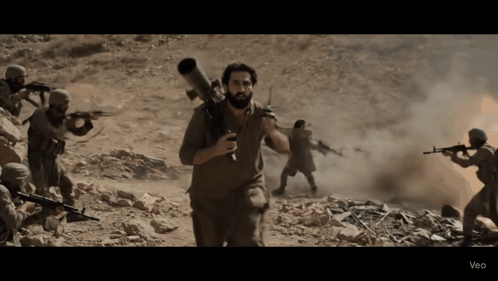 Content Description: a man carrying a rocket launcher is surrounded by soldiers and the word veo is on the bottom