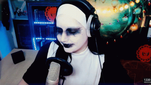 Content Description: a woman in a nun costume is talking into a microphone with headphones on